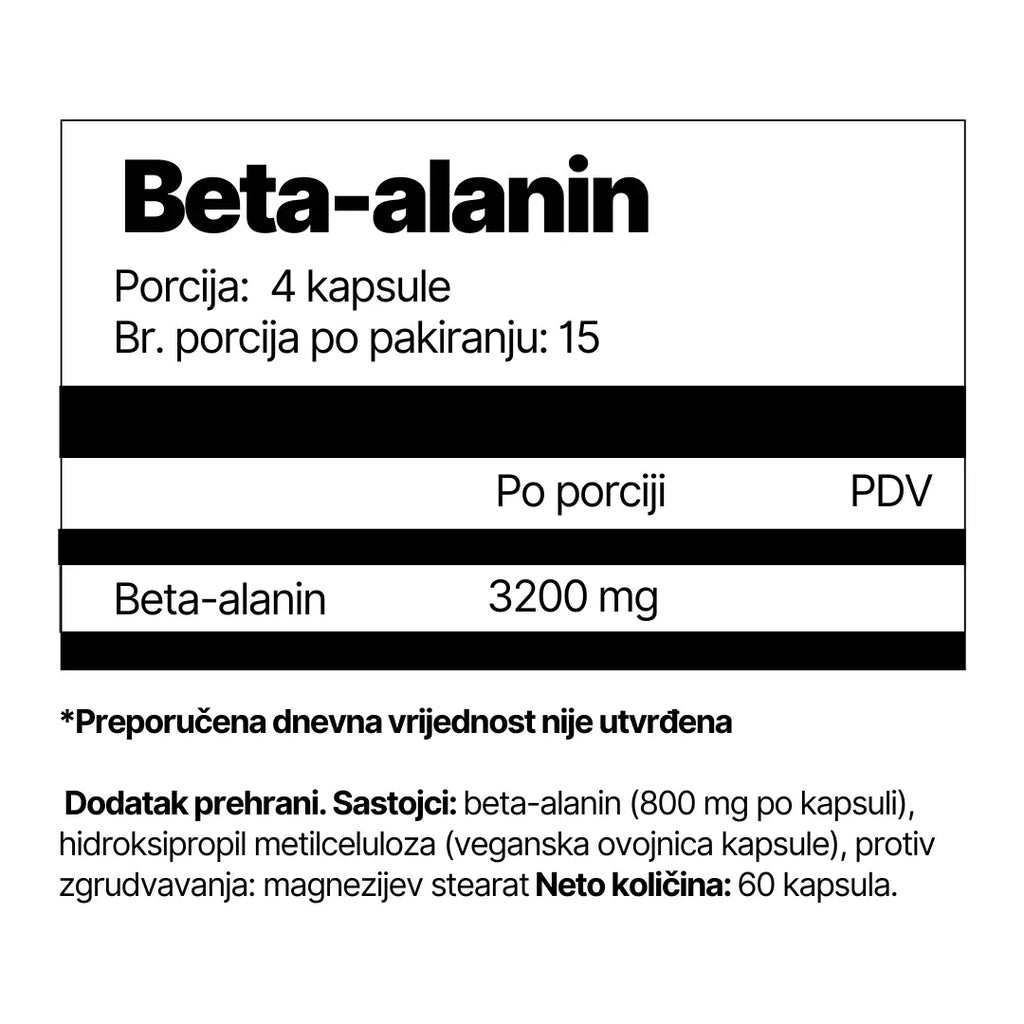 Dodatak prehrani. Sastojci: beta-alanin (800 mg po kapsuli), hidroksipropil metilceluloza (veganska ovojnica kapsule), protiv zgrudvavanja: magnezijev stearat Neto količina: 60 kapsula.