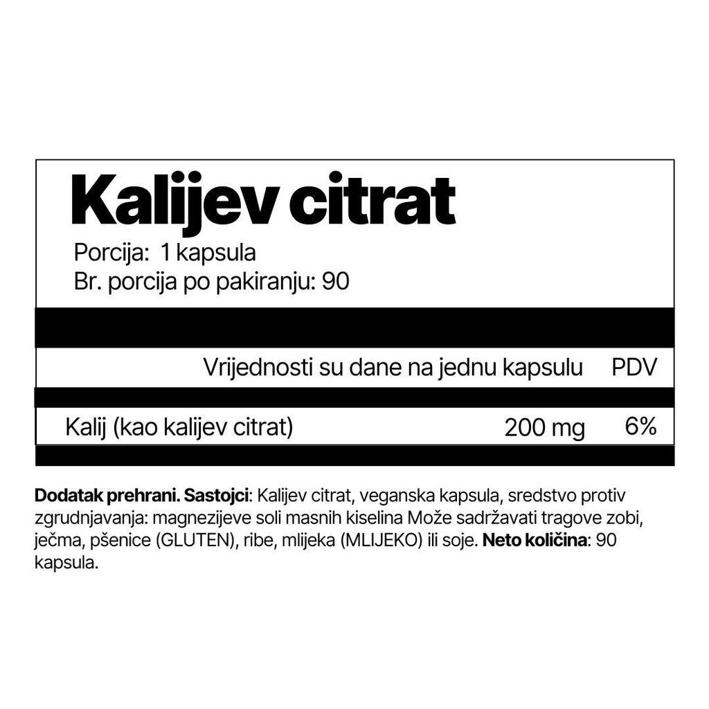 Dodatak prehrani. Sastojci: Kalijev citrat, veganska kapsula, sredstvo protiv zgrudnjavanja: magnezijeve soli masnih kiselina Može sadržavati tragove zobi, ječma, pšenice (GLUTEN), ribe, mlijeka (MLIJEKO) ili soje. Neto količina: 90 kapsula.