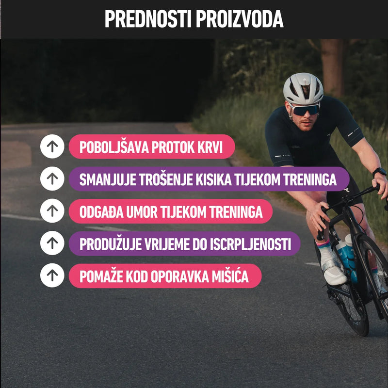 Bilo da si biciklist koji savladava uspon, trkač koji odrađuje sprint intervale ili triatlonac koji želi zadržati snagu u zadnjim kilometrima — Nitrati+ ti pomažu ići dalje s manje napora.