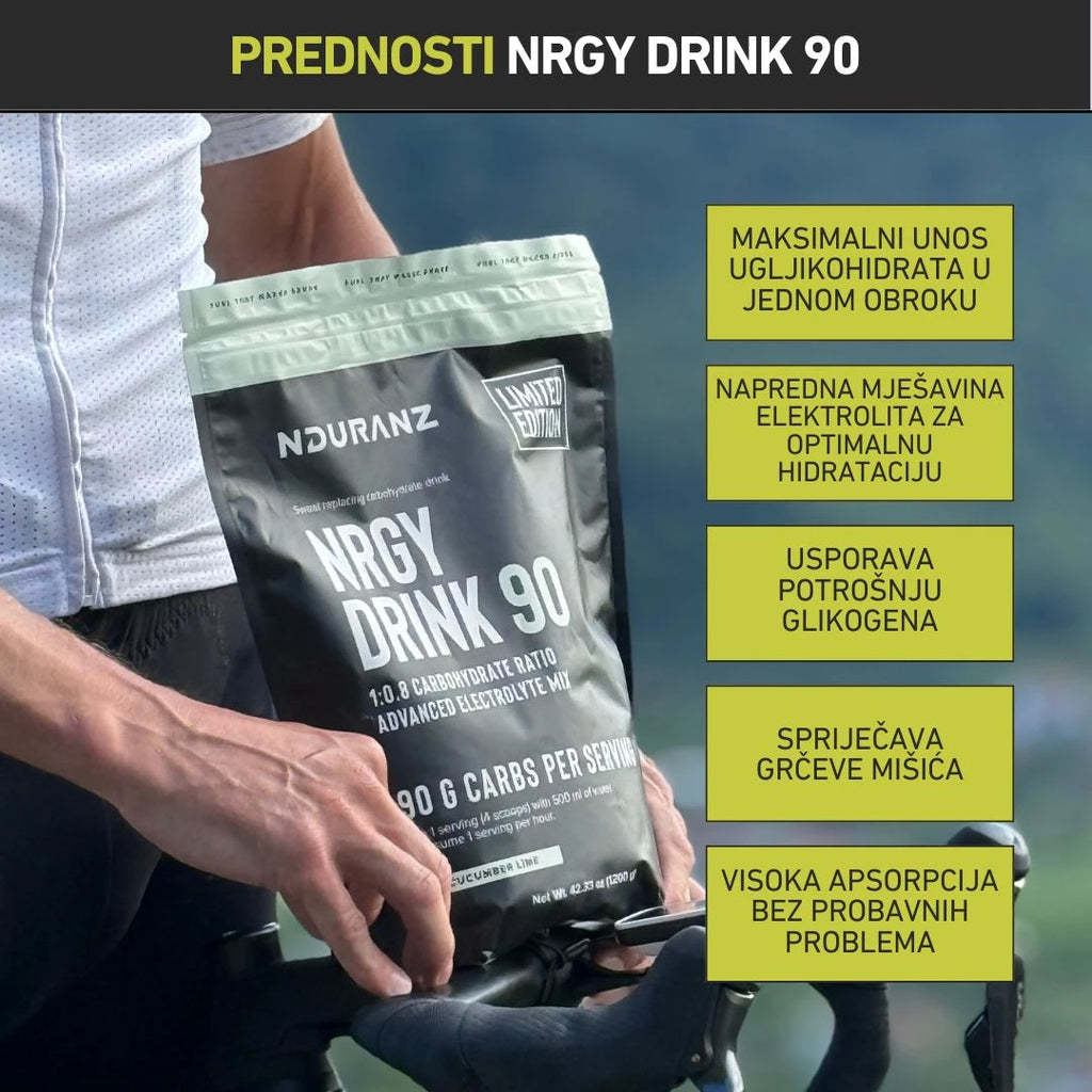 Nrgy Drink 90 je sportski napitak prilagođen za veći unos energije. Iako sadrži jednaku količinu ugljikohidrata po mjerici (22,5 g) kao i Nrgy Drink 45, količina elektrolita i jačina okusa prilagođeni su višoj količini u jednoj boci.