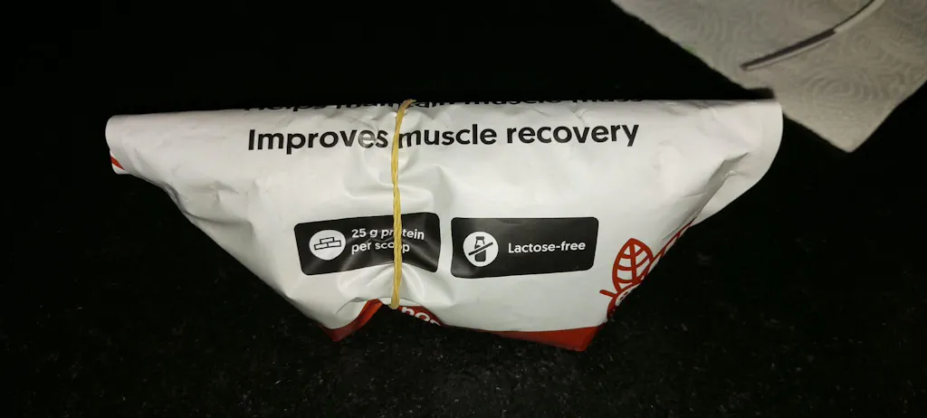 Dodatak prehrani. Sastojci: izolat sojinog proteina (SOJA), izolat proteina graška, glicin, maltodekstrin, kakao u prahu s reduciranim udjelom masti, arome, zaslađivači (sukraloza, acesulfam K). Neto količina: 600 g.